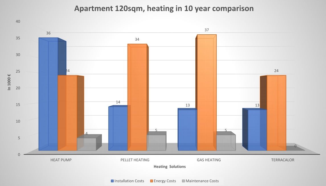 Der Architekt war offen für neue Technologien, die Heizung war bei der Anschaffung 30% günstiger als eine Wärmepumpe. Bei den Betriebskosten liegen wir je nach Heizverhalten 10 -20% unter einer Wärmepumpe. Der Kunde hat durch TerraCalor mehr Wohnraum, weniger Wartung und ein gesünderes Wohnklima.